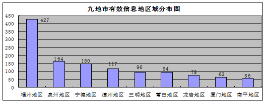 1369件有效信息事项地域分布,省级单位3件,福州地区427件,泉州地区164件,宁德地区150件,漳州地区117件,三明地区96件,莆田地区94件,龙岩地区78件,厦门地区63件,南平地区56件,外省39件,地址不详82件。