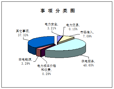 1369件有效信息按事项类别划分,供电服务666件,占48.65%;市场准入97件,占7.09%;电力安全44件,占3.21%;电力成本价格和收费4件,占0.29%;电力交易2件,占0.15%;非电能源45件,占3.29%;其它事项511件,占37.33%。